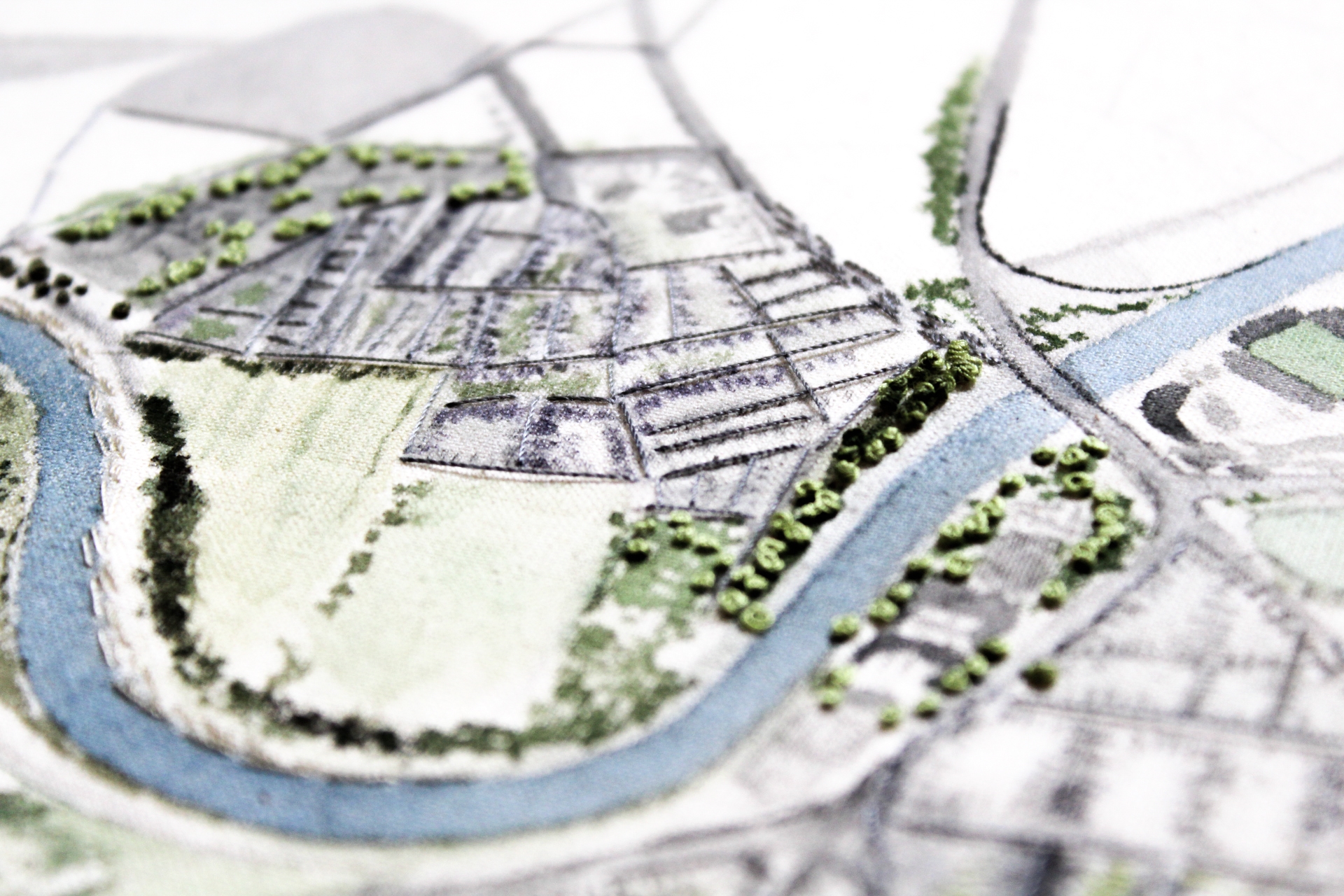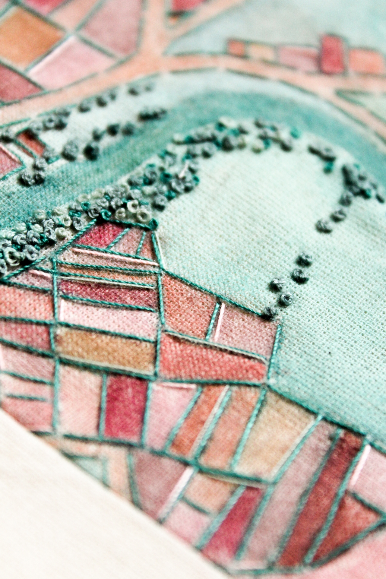 I traced the contours of landscapes with hand-embroidered motifs, using various techniques including embroidery, patchwork, and digital explorations. This slower approach to making allowed me to form a deeper connection with my work, providing a better understanding of the materials I used. My research into different types of maps, from traditional to modern, and our increasing reliance on digital mapping, was integrated into my textile work, where I balanced creative inspiration with practical execution.